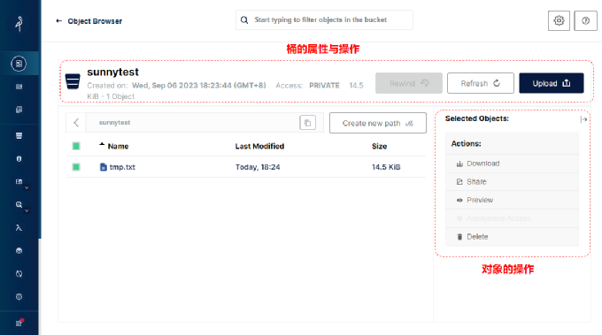 如果我们选择刚才上传的对象可以看到右侧会有所变化。此时会有几个对象操作相关的按钮,比如下载对象、分享对象和删除对象等等。