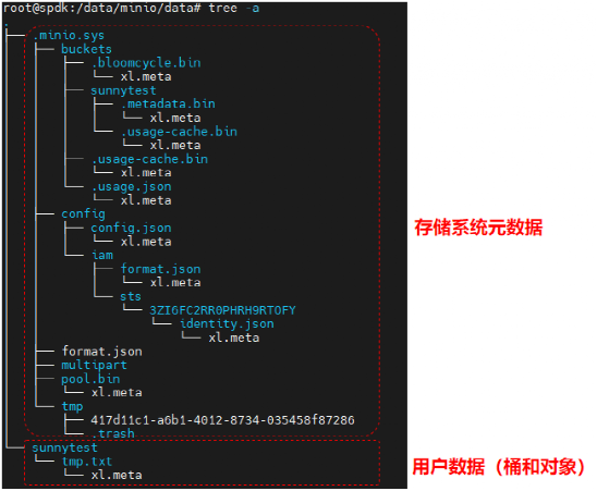 有些同学可能会好奇数据是如何存储的。我们可以看一下目录结构,具体如下图所示。在该目录中Minio会创建一个隐藏的目录来存放一些元数据。而桶和对象也都会创建对应的目录来管理,具体则是放在xl.meta文件中。但xl.meta也并不是原始文件的内容,而是有一定格式的。目录中这些文件的内容细节我们后续会详细介绍,本文不再赘述。