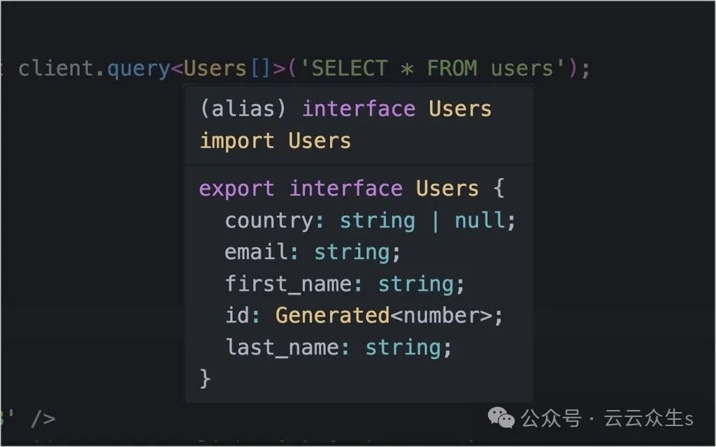 以下是我在 PostgreSQL 查询中使用生成类型的示例,但这些类型定义也可以用作组件的 props 接口的一部分。