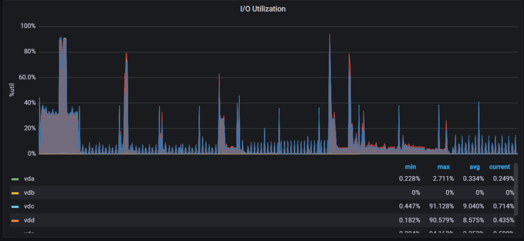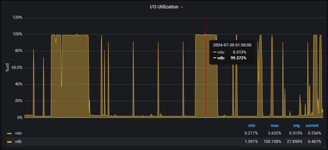 数据库进程CPU使用率保持在200%左右, 磁盘IO使用率经常达到100%,内存和网络没有异常。
