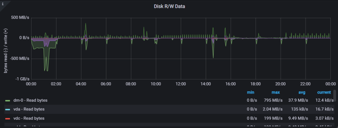 总体磁盘读写速度最大为800M/S(4块盘组成dm-0):