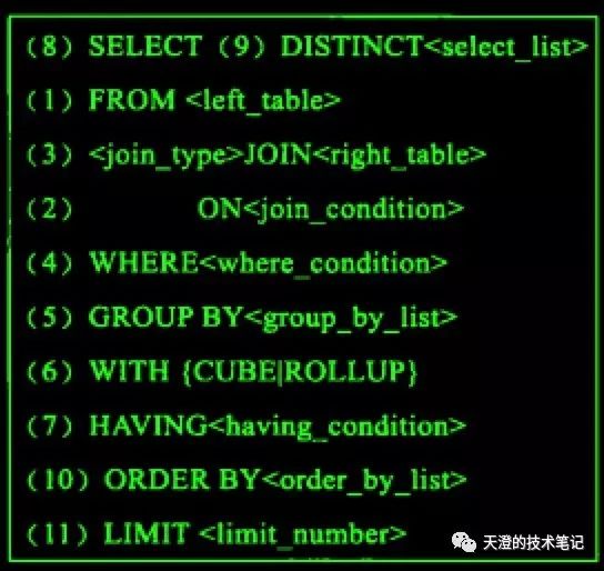 最先执行的总是FROM操作,最后执行的是LIMIT操作。其中每一个操作都会产生一张虚拟的表,这个虚拟的表作为一个处理的输入,只是这些虚拟的表对用户来说是透明的,但是只有最后一个虚拟的表才会被作为结果返回。如果没有在语句中指定某一个子句,那么将会跳过相应的步骤。