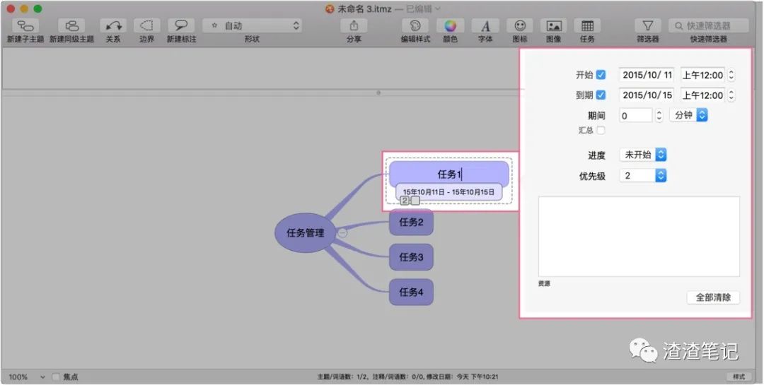 得益于 iThoughtsX 中每一个节点的属性里,都引入了任务管理的基本概念:开始/截止日期、优先级、进度等,使得你可以用它来做任务管理、GTD 等等。