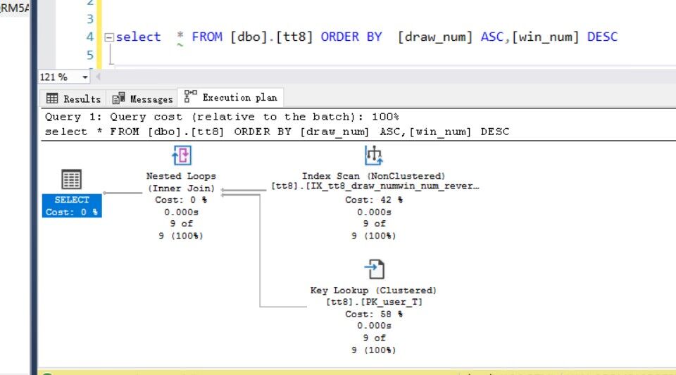 GO建了非聚集索引之后,执行计划如下,可以看到无法用到刚才建的非聚集索引[IX_tt8_draw_numwin_num],因为建索引时候,两个字段的排序顺序都是单向遍历的,统一升序或统一降序