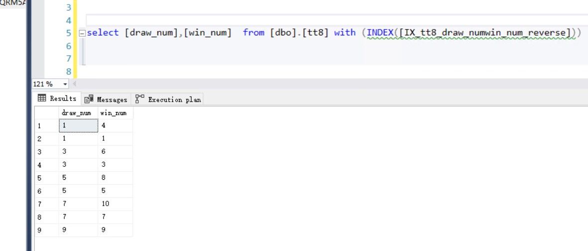 select [draw_num],[win_num] from [dbo].[tt8] with (INDEX([IX_tt8_draw_numwin_num_reverse]))