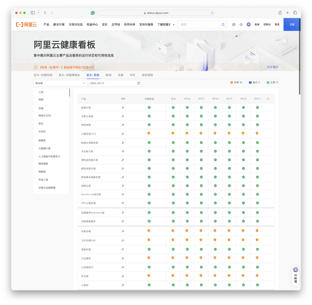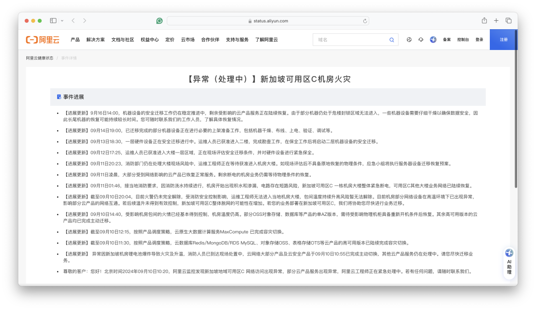 2024年9月10日,阿里云新加坡可用区C数据中心因锂电池爆炸导致火灾,到现在已经过去整整一周 (09-17) 仍未恢复。