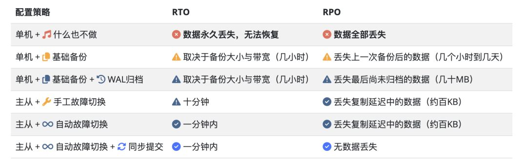 容灾的核心指标是 RTO (恢复耗时)与 RPO(数据损失),而不是什么几个9的可用性 —— 道理很简单,你可以单凭运气做到不出故障,实现 100% 的可用性。但真正检验容灾能力的,是灾难出现后的恢复速度与恢复效果。