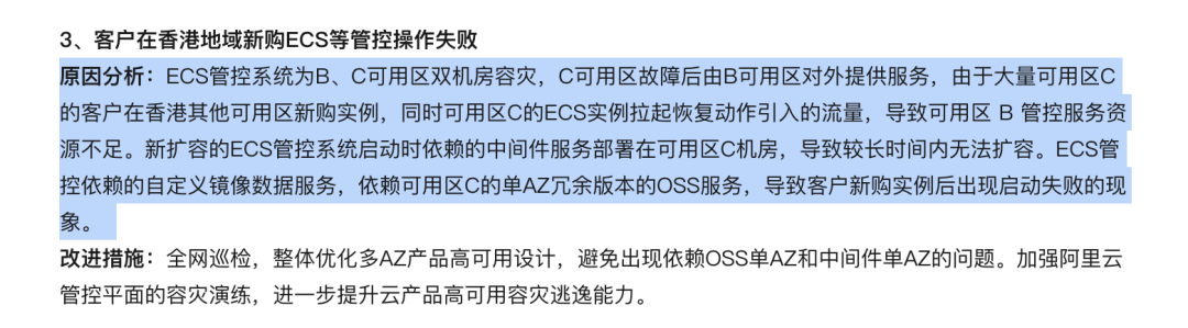 那么,为什么在实战中,单个RDS集群故障可以做到的指标,在可用区级故障时就做不到了呢?从历史的故障中我们不难推断 —— 数据库高可用依赖的基础设施本身,很可能就是单AZ部署的。包括在先前香港盈科机房故障中展现出来的 :单可用区的故障很快蔓延到了整个 Region —— 因为管控平面本身不是多可用区容灾的。