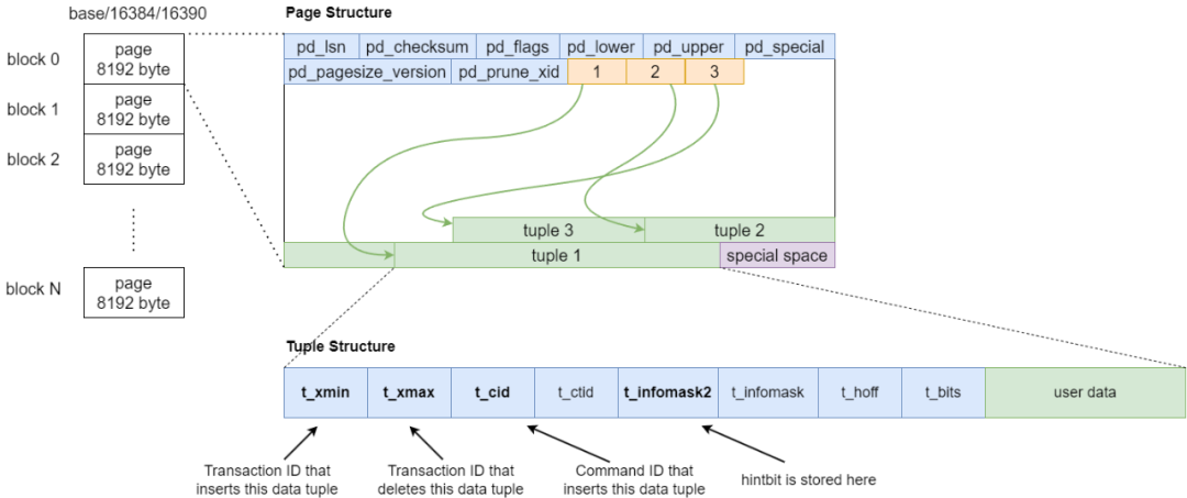 这些指标被归为一类,因为它们都存储在每个堆数据元组的头部,并且每个数据元组可能具有不同的值,从而导致不同的可见性检查结果。下面的图像显示了它们存储在元组头部的位置: