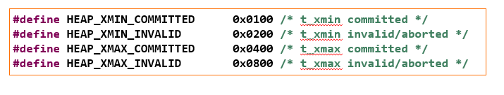 这是一个标志字段,用于存储来自CLOG的查询结果,这样PostgreSQL就不必每次都查找CLOG。CLOG指的是提交日志,下文会详细解释。 如果hintbit设置了HEAP_XMIN_COMMITTED标志,这意味着插入此元组的事务ID(即xmin)已提交。 如果PostgreSQL可以直接从hintbit获取这些信息,那么它可以节省一些查找CLOG的时间,从而提高性能。 可能的hintbit标志值如下: