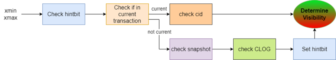 xmin、xmax、cid 和 hintbit 存储在元组头部。 快照(snapshot)、事务ID在启动事务时由事务管理器提供。 CLOG 存储在共享内存中