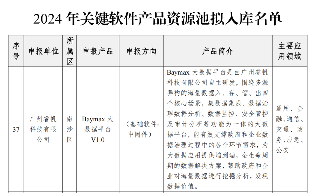 近日,广州市工业和信息化局发布了2024年关键软件产品资源池拟入库名单。睿帆科技Baymax大数据科学平台凭借卓越的技术实力、广泛的市场认可和良好的信创环境适配性等优势成功入库。