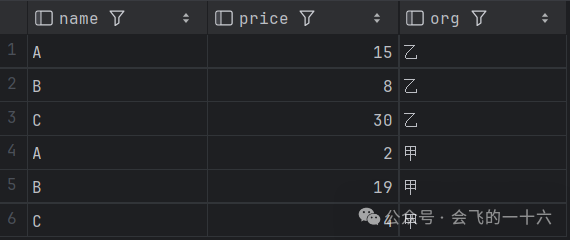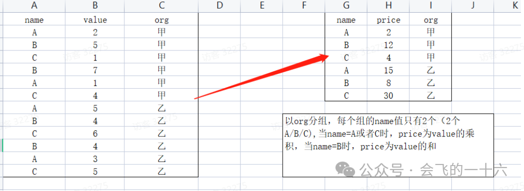 在做数据处理的时候,尤其是复利累积的时候,有时候会有这样一场景,通过某种条件找到一列数据[X1,X2,X3...Xn],然后想要求y=X1X2X3...Xn。下面给出一个具体案例来详细解释这一问题,如下图所示,每个组的name值只有2个(2个A/B/C),当name=A or C时,price为value字段的乘积,当name=B时候,price为vlaue字段的和。