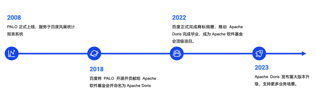2018年,百度将 Palo 贡献给了 Apache 软件基金会并重新命名为 Apache Doris,进入了开源开放的共建阶段。而 Palo 则作为百度云商业化产品,不仅包含 Doris 引擎,还包含云产品的各项产品功能,可以简单认为 百度 PALO 是基于 Doris 的云数仓产品。