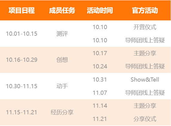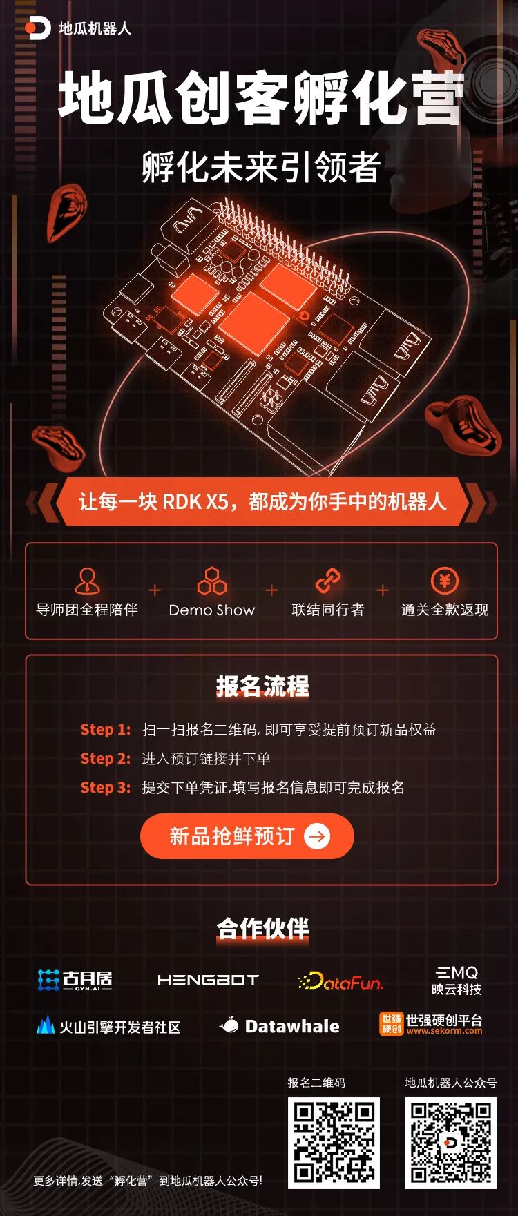 10.1号开始,所有入营成员,将根据项目日程参与孵化营活动,并在导师团的陪伴下完成三项任务,具体通过机制将在开营仪式上沟通。按时完成任务,将能够解锁全部福利,包括 RDK X5 下单金额的全额返现和丰厚奖品、加入地瓜机器人团队的内推机会、持续参与地瓜机器人新品内测、与行业大咖面对面交流等。