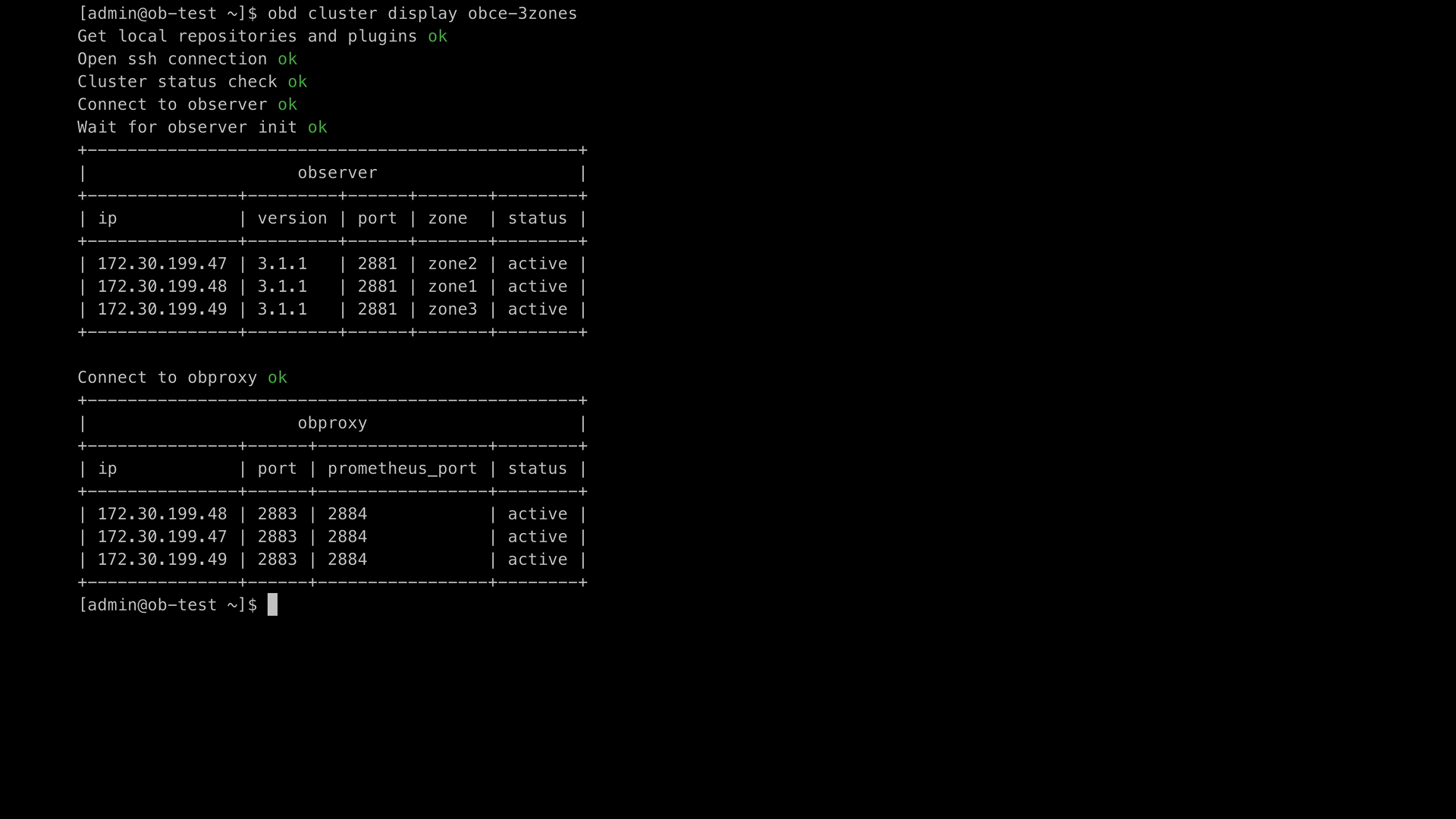 接下来我们使用 OBD,一起部署 OBAgent 服务。OBAgent 可以跟 OceanBase 集群同时启动,也可以先启动一个 ObceanBase 集群,再启动 OBAgent。我在启动 OBAgent 之前已经有了一个 ObceanBase 集群,因此我单独启动 OBAgent 就可以了。我的集群信息如下: