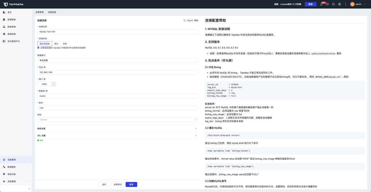 为保障任务的顺利执行,您需要为 MySQL 数据库开启 Binlog(可实现增量数据同步),然后为数据复制/开发任务创建一个数据库账号。
