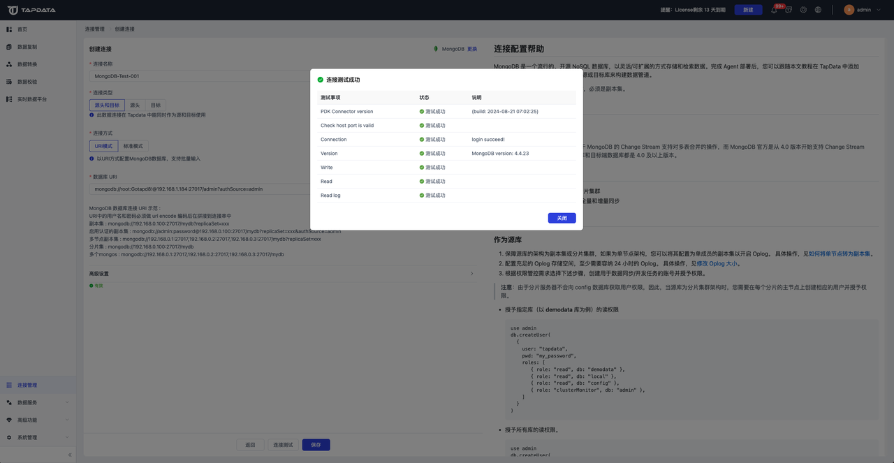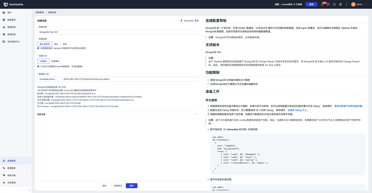 参照 MySQL 连接创建流程,完成 MongoDB 连接配置信息填写,添加数据目标: