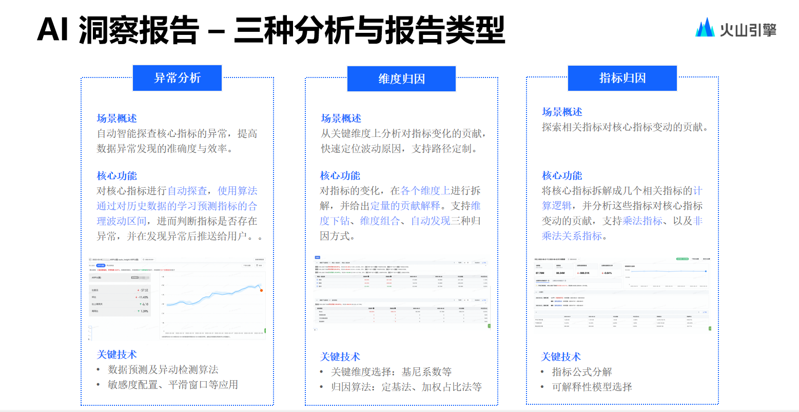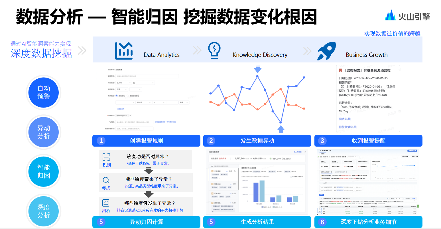 接着是数据分析场景。在数据分析场景中,开发团队希望能够帮助用户更快捷地进行异常指标查询以及异常归因,不想再为用户配置例如当数据指标低于10%或5%再发送警告此类傻瓜式警告方式。