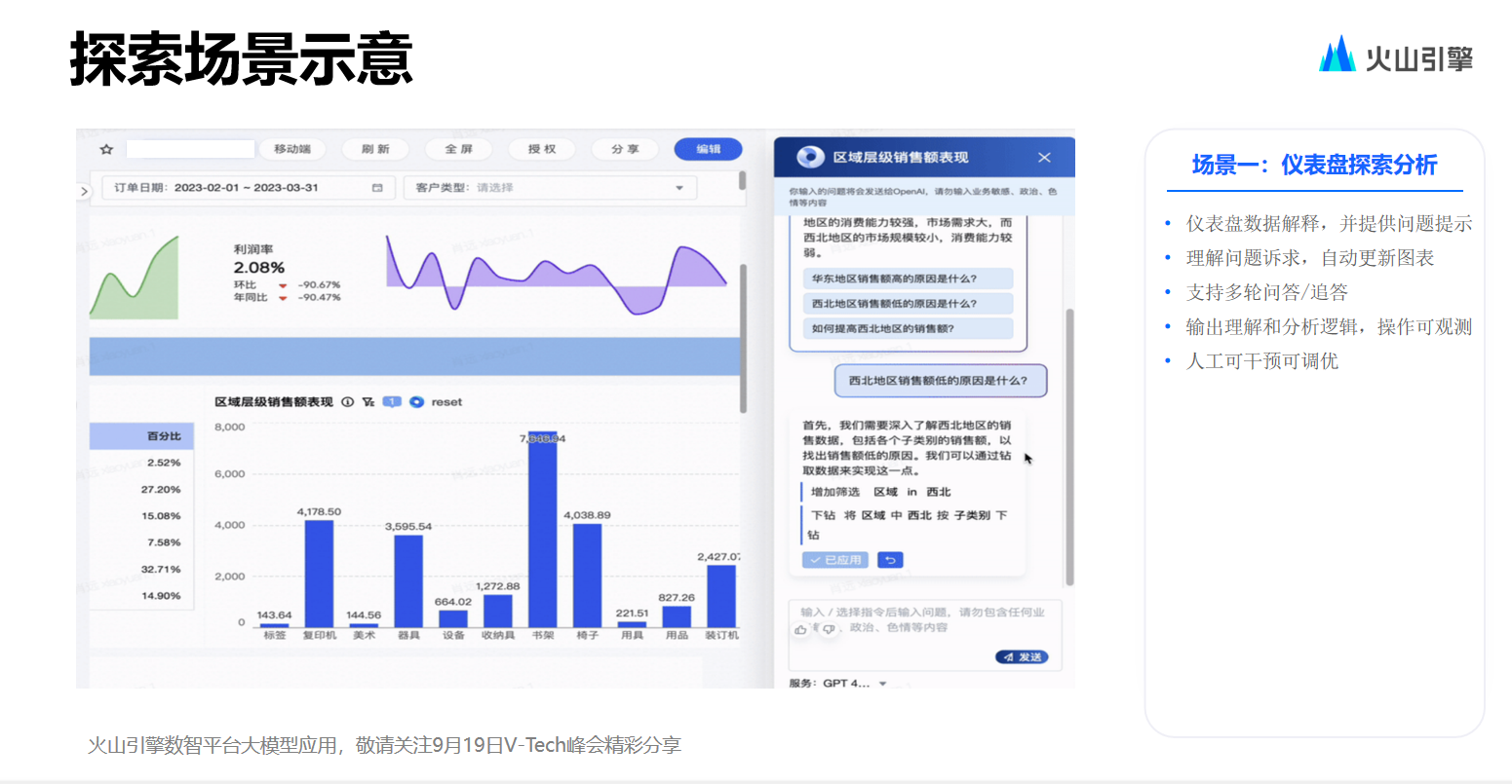 而在严肃场合,需要的是一个非常精准的数字,用户会非常想要了解其统计口径是什么,它又是如何得出这个结论的。因此在落地场景中,一个极为重要的原则是必须让用户清楚大模型到底做了什么,或者说大模型做了哪些部分,以及接下来将如何处理这个请求,这个数据究竟是如何得来的,这一点十分关键,否则,即便模型准确率能够达到 95%以上,其在数据产品中的落地也较为困难。