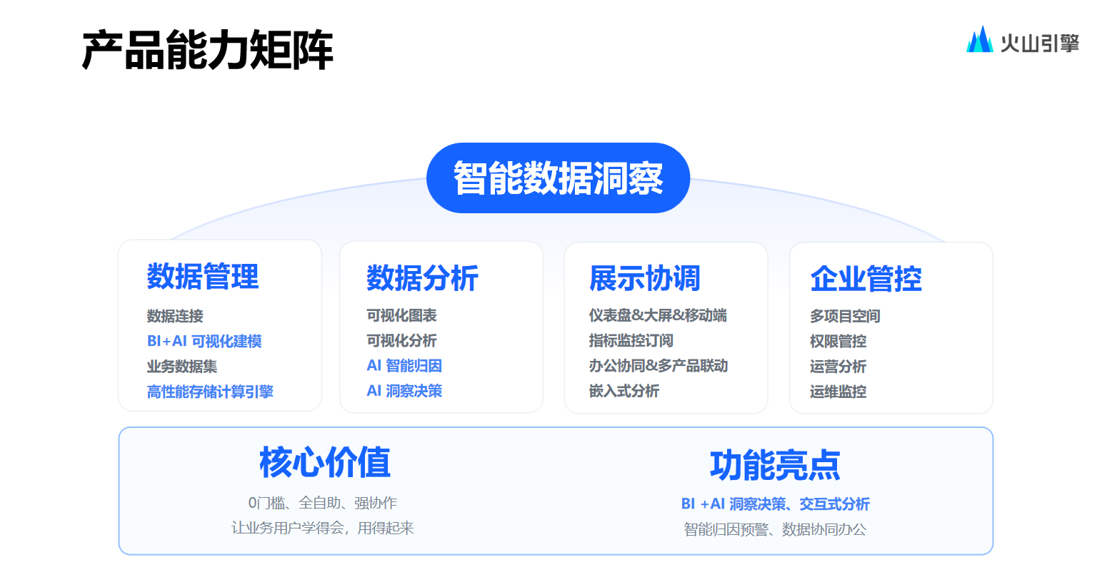 当前,火山引擎数智平台旗下的智能数据洞察DataWind已构建起包含了数据准备与管理,数据分析,以及多端展示等功能的相对完善的产品能力矩阵,同时赋予产品系统高度可运维优势。