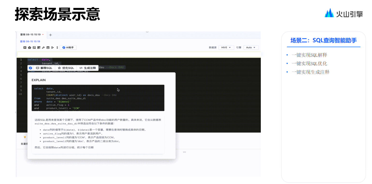 接着再来看一下 SQL 查询的场景,本产品能够进行解释以及优化。在editor中可以运用自然语言来帮助生成相应的 SQL 以及与 notebook 相关的一些代码。