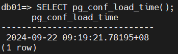 2、获取磐维数据库最近一次加载服务器配置文件的时间戳:pg_conf_load_time( )