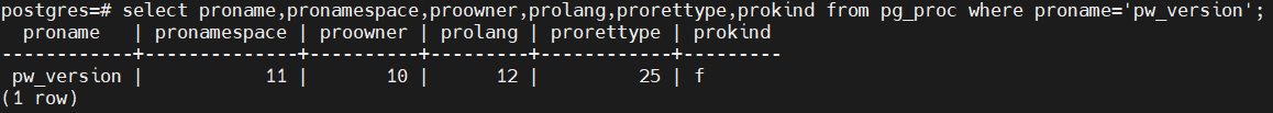 可以通过查询PG_PROC系统表,来查看有内置函数的相关信息。例如查看pw_version这个函数的相关信息: