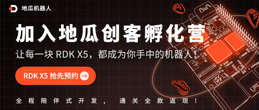 从焊接第一个电路到编写第一条指令,从调试传感器到优化运动控制算法,每一步都充满了挑战与乐趣。【地瓜创客孵化营】将不仅为你提供先进的开发工具和平台,还有来自行业专家的技术指导,全程陪伴式开发,确保你能将每一个细节打磨得尽善尽美。我们相信,每一块RDK X5在你的手中,都有成长为复杂智能机器人的潜力。我们希望不仅孵化出优秀的机器人项目,更能孵化出一批批加速机器人生态发展的领导者。