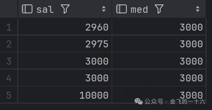 select sal,avg( case when abs(rn - (cnt + 1) 2) <= 1 2 then sal end) over () medfrom (select sal,row_number() over (order by sal) rn,count(1) over () cntfrom sal) t