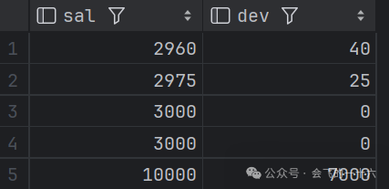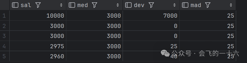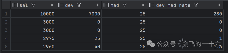 select sal, dev, mad, dev mad dev_mad_ratefrom (select sal, med, dev, percentile(cast(dev as int), 0.5) over () madfrom (select sal, med, abs(sal - med) devfrom (select sal,avg(case when abs(rn - (cnt + 1) 2) <= 1 2 then sal end) over () medfrom (select sal,row_number() over (order by sal) rn,count(1) over () cntfrom sal) t) t) t) t