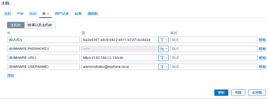 主机和模板配置完毕之后,我们要在宏选项卡配置三个参数,用来告诉模板如何去目标esxi集群获取信息。