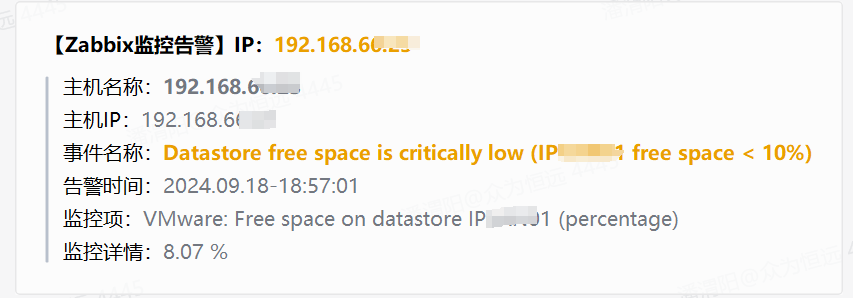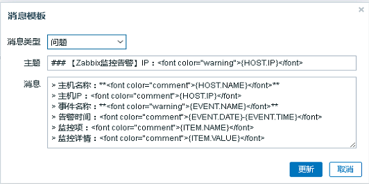 ### 【Zabbix监控告警】IP:<font color="warning">{HOST.IP}</font>> 主机名称:**<font color="comment">{HOST.NAME}</font>**> 主机IP:<font color="comment">{HOST.IP}</font>> 事件名称:**<font color="warning">{EVENT.NAME}</font>**> 告警时间:<font color="comment">{EVENT.DATE}-{EVENT.TIME}</font>> 监控项:<font color="comment">{ITEM.NAME}</font>> 监控详情:<font color="comment">{ITEM.VALUE}</font>