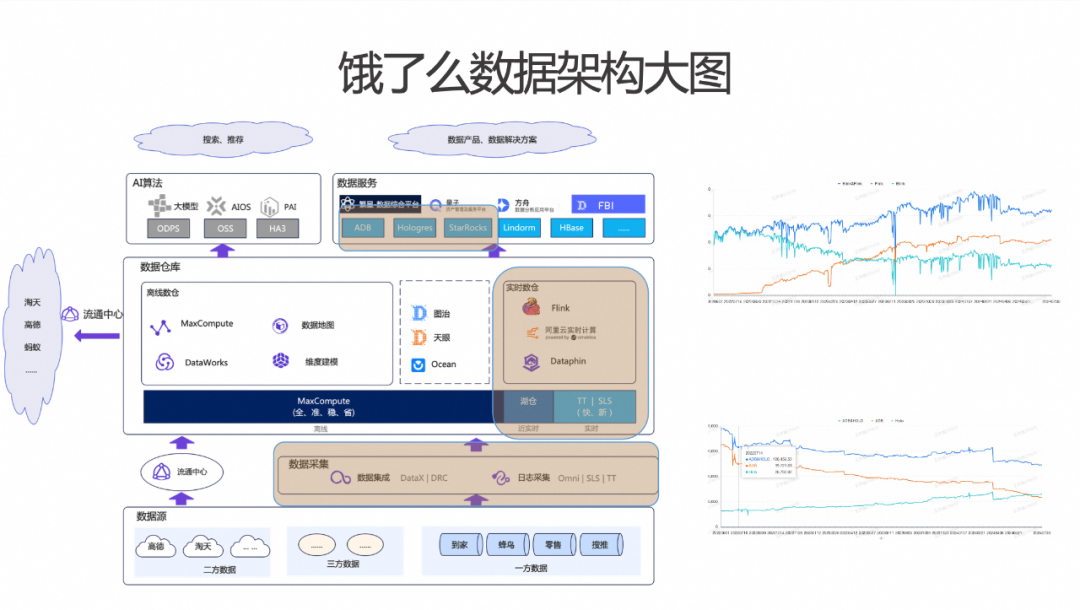 饿了么整体数据架构大图主要由三个层面组成,分别为数据采集层,数据加工层,数据服务层。相关的数据组件依托阿里云组件。整体数据采集使用 DataX 和 DRC 链路来进行数据库 Binlog 的采集。日志采集主要使用内部的Omni 平台来收集用户行为数据,而应用层的日志通过SLS和TT来进行相应的日志接入。