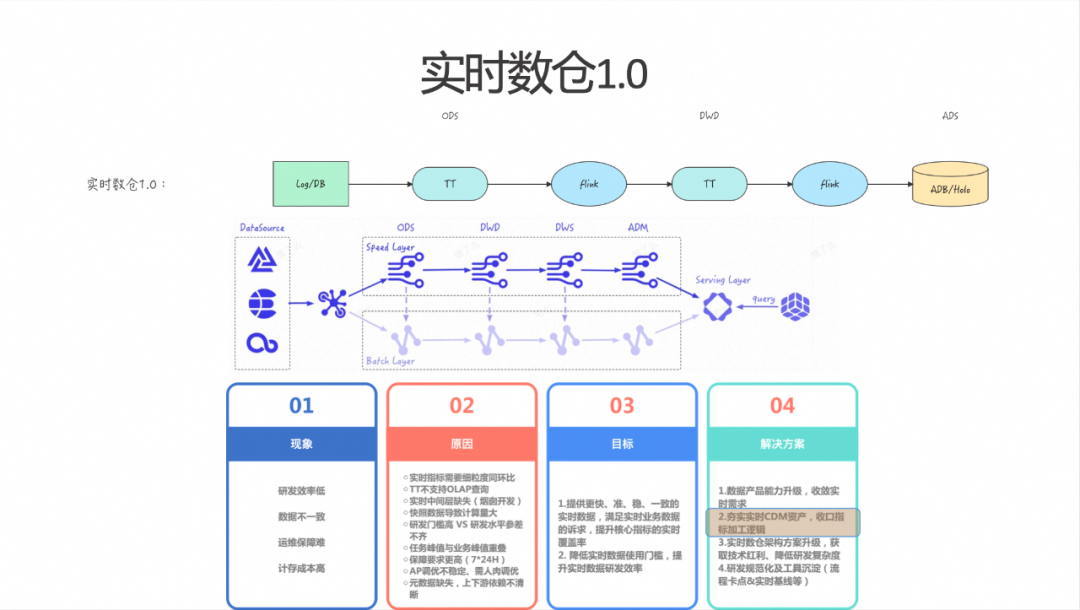 基于上述情况,我们期望达成以下两个目标:首先是确保数据能够更快、更准、更稳、更一致;其次是提升整体的开发效率和运维效率。具体的解决方案总结为四个要点:
