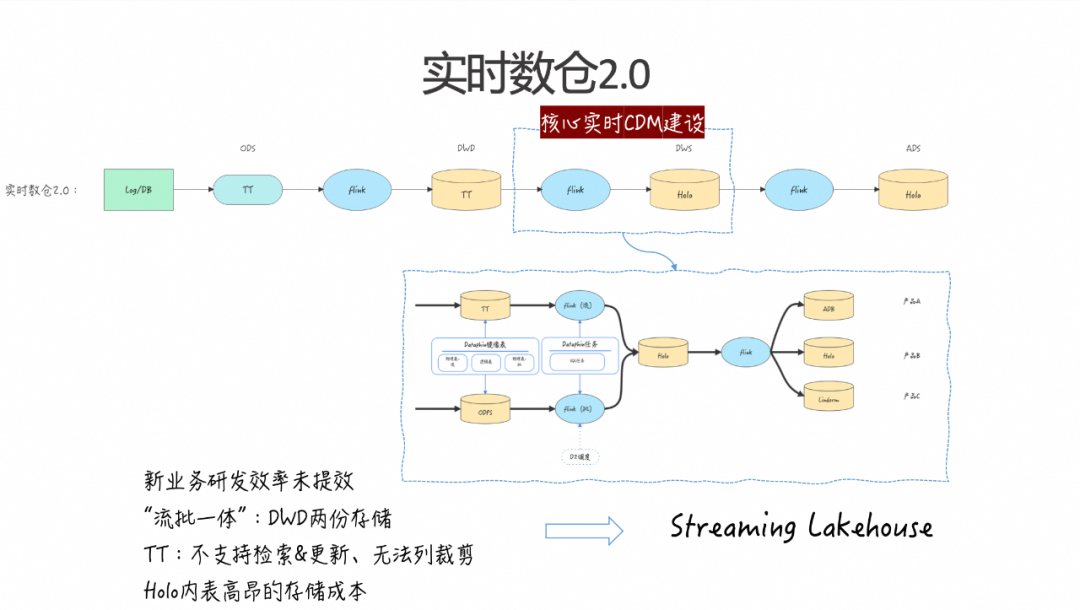 完成这条链路后,整体的核心资产消费链路和研发效率得到了提升,数据一致性也得到了保障。然而,仍然存在一些问题。例如,对于一些新兴业务,这条链路并不适用,它主要支持存量的重要业务。另外,虽然这条链路旨在实现流批一体化,但实际上并未完全实现这一目标。因为在 DWD 层,数据实际上有两份存储,一份在 TT,一份在 ODPS。