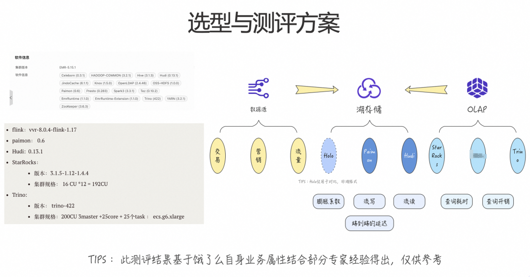 在整个选型过程中,使用了饿了么最核心的交易、营销和流量三个域的明细数据作为测试数据,并将数据写入对应的湖存储格式中。我们当时评测选择了 Paimon + Hudi 这两种湖格式。为了方便整体验证还与现有的 OLAP 集群的内表方案进行对比。