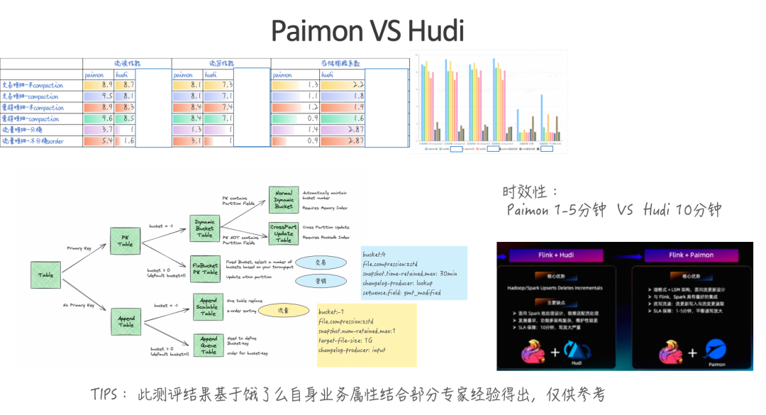 图中左上角展示了经过多轮测试后得出的结果,整体排名基本上都是 Paimon 优于 Hudi。同时,Paimon 的性能也接近 OLAP 集群内表方案的查询性能。但是在端到端的时效性方面,OLAP 集群内表方案仍然是最快,可以达到秒级别。Paimon 的时效性测试结果大约在1到5分钟,平均约为3分钟。Hudi 在这一块的延迟一般在10分钟左右。