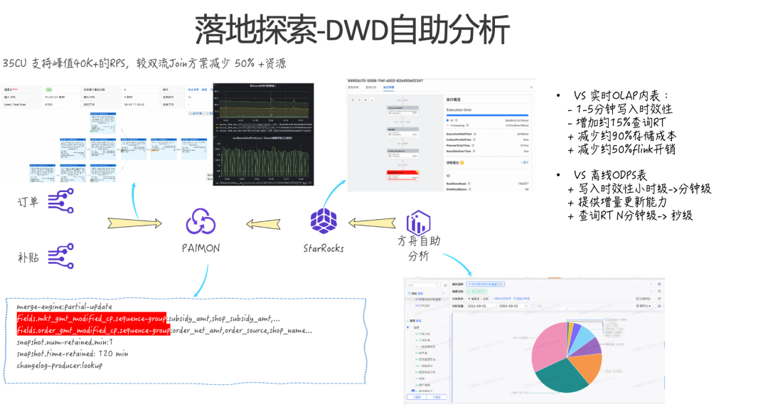 接下来主要介绍基于交易和补贴的自助分析场景。首先,数据源提供订单流和补贴流两个实时流。在传统方案中,这两个流在Flink任务中进行双流 Join 处理后写入 OLAP 集群内表,再基于 OLAP 集群内表提供自助分析服务。引入 Paimon 之后,两条流直接写 Paimon 的 Partial-update 表,指定不同流中的 Sequence Group 来进行对应字段的版本控制。在这种情场景下,整体 Flink 的资源开销相比原来的双流 Join 方案减少了大约50%,同时系统的整体稳定性也显著提升。