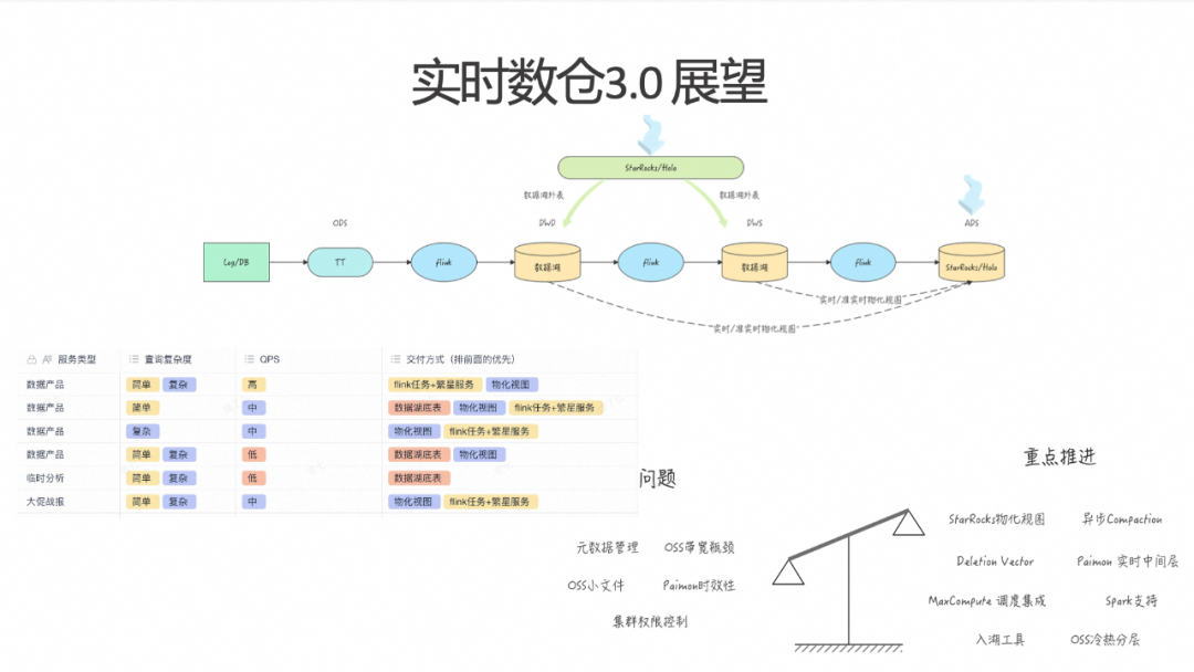 具体的交付方案如上图左下角所示,不同场景可以选择不同的交付方案,利用现有的实时数据资产,提升研发效率,不需要为每个需求从头开发具体的 Flink 任务。然而仍会遇到一些问题:OSS 带宽瓶颈在压测过程中已经显现出来需要解决,同时 OSS 上的小文件问题也是需要解决的。Paimon 的时效性目前为1到5分钟,这限制了实时数仓的分层,无法实现多层依赖,尽管也不推荐过多层数。虽然 Paimon 和 StarRocks 现有的元数据可以通过 DLF 管理,但与内部原有的元数据管理缺乏打通,需要进一步拓展。此外,目前集群的权限控制相对较弱的,需要进行强化。