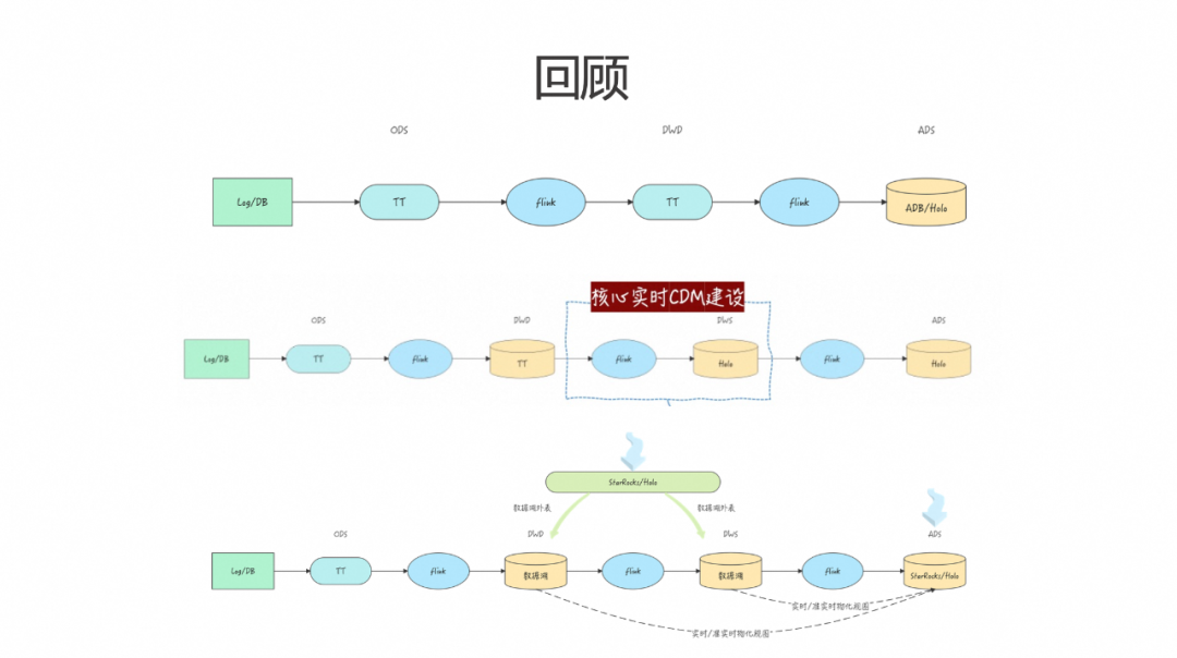 最后回顾一下饿了么整体实时数仓的建设历程,大致可以分为几个阶段。首先是相对原始的开发阶段,这一阶段主要建设实时的 DWD 层,各个应用层通过 Flink 任务各自生成自己的 ADS 数据。在这一过程中,ADS 层出现了大量数据一致性问题和重复开发的问题。为了解决这些问题,我们构建了实时的 CDM 层,从而解决了共性问题。然而,对于新增业务和场景的支持仍显不足。因此,我们引入了实时湖仓方案。虽然该方案目前仍在探索阶段,但已经在一些具体场景中实现了落地。未来,我们希望在 Paimon 和 StarRocks 上进行更多的探索和应用。