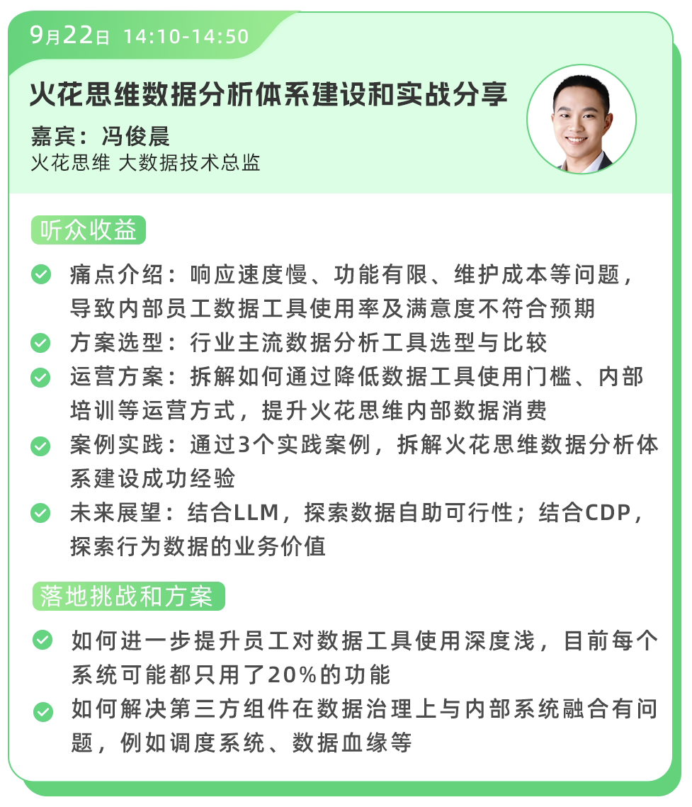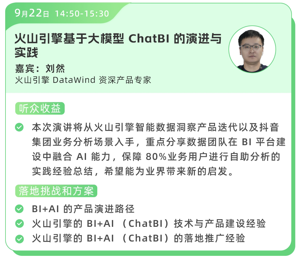 出品,将从基于大模型的ChatBI建设、企业数据分析体系建设等多方向,为听众带来丰富的实践经验分享。