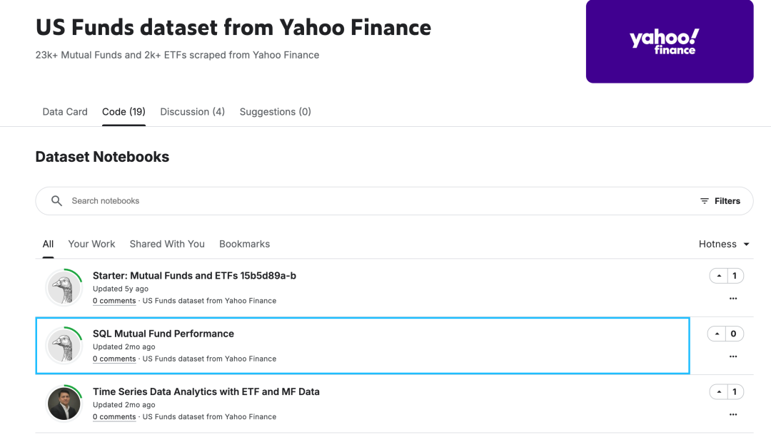 Kaggle上不仅提供了数据,也提供了很多数据科学工作者的代码。在Kaggle上,US Funds dataset from Yahoo Finance数据集对应的分析代码有19个: