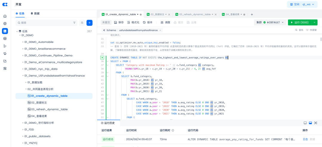 用动态表(Dynamic table)来存放计算结果,考虑到底表变化和结果表都是统计结果,非常适合用动态表来简化数据加工逻辑。 数据标准:对数据进行详细注释,方便团队理解和大模型理解数据结构。 刷新动态表:不同于传统的大数据INSERT INTO/OVERWRITE的结果刷新方式,云器Lakehouse的动态表采用增量计算技术,通过REFESHESH 动态表的方式只对变化数据进行计算,从而大幅提升了数据刷新速度并降级计算成本,从而提高性价比,达到降本增效的目的。 查看结果,通过SELECT语句查看计算结果。
