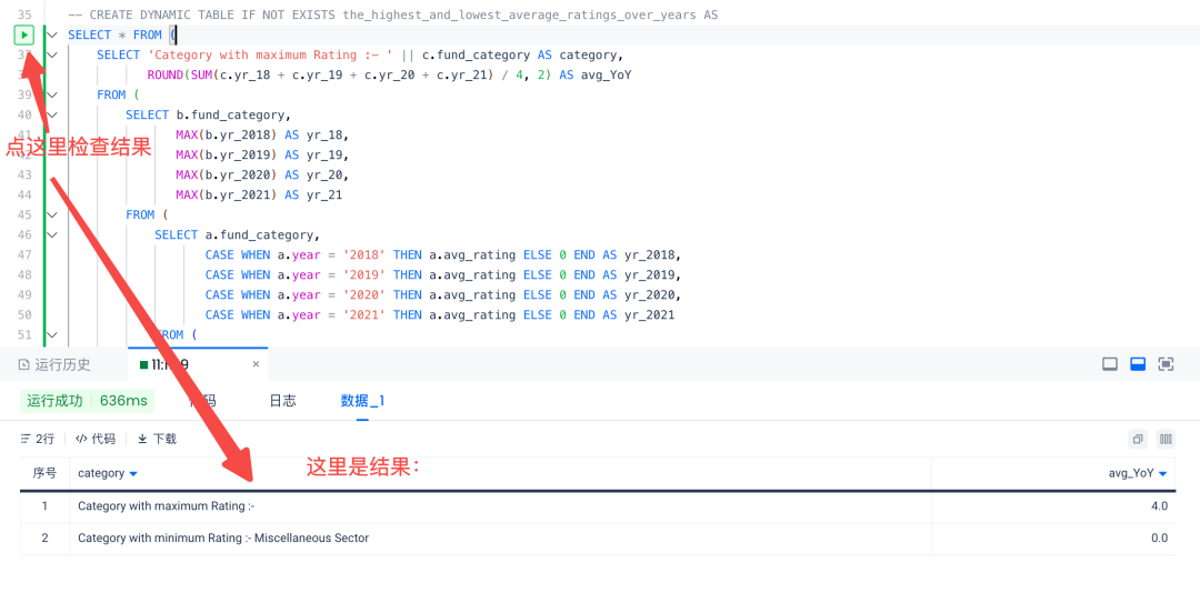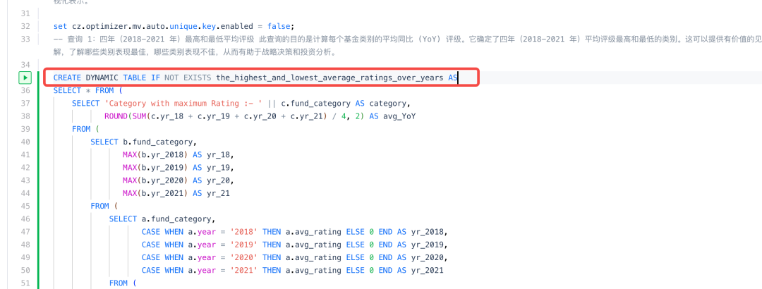 set cz.optimizer.mv.auto.unique.key.enabled = false;-- 查询 1:四年(2018-2021 年)最高和最低平均评级 此查询的目的是计算每个基金类别的平均同比 (YoY) 评级。它确定了四年(2018-2021 年)平均评级最高和最低的类别。这可以提供有价值的见解,了解哪些类别表现最佳,哪些类别表现不佳,从而有助于战略决策和投资分析。CREATE DYNAMIC TABLE IF NOT EXISTS the_highest_and_lowest_average_ratings_over_years ASSELECT * FROM (SELECT 'Category with maximum Rating :- ' || c.fund_category AS category,ROUND(SUM(c.yr_18 + c.yr_19 + c.yr_20 + c.yr_21) 4, 2) AS avg_YoYFROM (SELECT b.fund_category,MAX(b.yr_2018) AS yr_18,MAX(b.yr_2019) AS yr_19,MAX(b.yr_2020) AS yr_20,MAX(b.yr_2021) AS yr_21FROM (SELECT a.fund_category,CASE WHEN a.year = '2018' THEN a.avg_rating ELSE 0 END AS yr_2018,………………