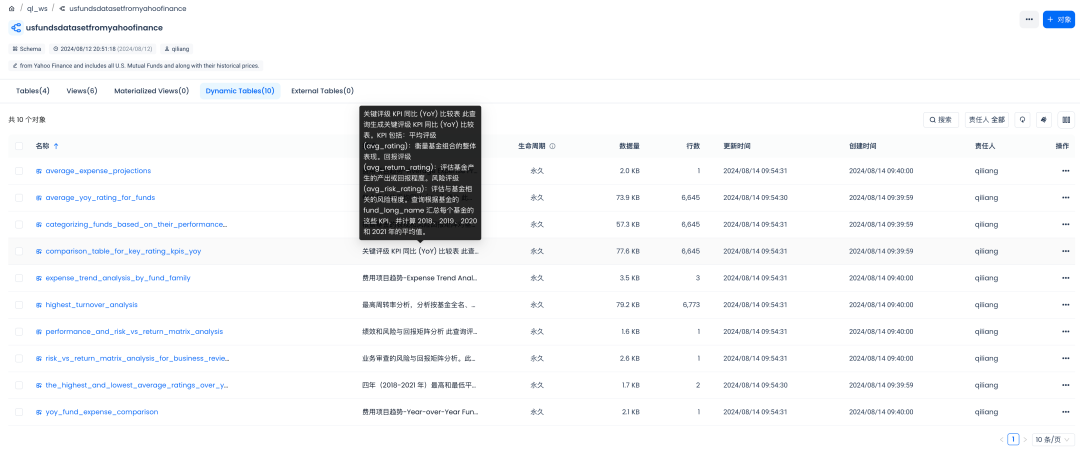 ALTER DYNAMIC TABLE the_highest_and_lowest_average_ratings_over_yearsSET COMMENT '四年(2018-2021 年)最高和最低平均评级 此查询的目的是计算每个基金类别的平均同比 (YoY) 评级。它确定了四年(2018-2021 年)平均评级最高和最低的类别。这可以提供有价值的见解,了解哪些类别表现最佳,哪些类别表现不佳,从而有助于战略决策和投资分析。';ALTER DYNAMIC TABLE average_yoy_rating_for_fundsSET COMMENT '每个基金的平均同比 (YoY) 评分 此查询根据基金的 fund_long_name 计算每个基金的平均同比 (YoY) 评分。它汇总了每年(2018、2019、2020 和 2021)的评分,并计算这些年的平均评分。从此分析得出的业务推论包括确定平均同比评分最高和最低的基金类别、突出显示不一致之处和趋势以及确定评分为 0 的类别。此信息对于了解各种基金类别随时间推移的业绩动态至关重要。';ALTER DYNAMIC TABLE comparison_table_for_key_rating_kpis_yoySET COMMENT '关键评级 KPI 同比 (YoY) 比较表 此查询生成关键评级 KPI 同比 (YoY) 比较表。KPI 包括:平均评级 (avg_rating):衡量基金组合的整体表现。回报评级 (avg_return_rating):评估基金产生的产出或回报程度。风险评级 (avg_risk_rating):评估与基金相关的风险程度。查询根据基金的 fund_long_name 汇总每个基金的这些 KPI,并计算 2018、2019、2020 和 2021 年的平均值。';ALTER DYNAMIC TABLE categorizing_funds_based_on_their_performance_and_risk_return_matrixSET COMMENT '根据基金的表现和风险回报矩阵对基金进行分类 此查询旨在通过根据基金的表现和风险回报矩阵对基金进行分类来确定绩效趋势。它有助于业务团队了解不同基金的表现及其相关的风险和回报特征。评级:反映基金的表现。风险评级:表示与基金相关的风险程度。回报评级:表示基金的产出或回报程度。该查询根据基金的平均评级将基金分为“表现良好”和“表现不佳”。它还将基金分为四个风险回报类别:高风险高回报、高风险低回报、低风险低回报和低风险高回报。';ALTER DYNAMIC TABLE performance_and_risk_vs_return_matrix_analysisSET COMMENT '绩效和风险与回报矩阵分析 此查询评估各种共同基金的绩效和风险回报状况,以进行业务审查。它比较了表现良好和表现不佳的基金的数量,并将它们归类为不同的风险回报矩阵。';ALTER DYNAMIC TABLE risk_vs_return_matrix_analysis_for_business_reviewSET COMMENT '业务审查的风险与回报矩阵分析。此查询分析各种共同基金的风险与回报矩阵,以帮助业务审查团队了解绩效趋势。重点是确定属于四类的基金:高风险高回报、低风险高回报、高风险低回报以及低风险低回报。业务推断是顶级组是低-低和高-高,检查点是评估低-低基金的数量,以确定对于普通客户来说低多少。';ALTER DYNAMIC TABLE highest_turnover_analysisSET COMMENT '最高周转率分析,分析按基金全名、基金类别、投资类型和规模类型分类的共同基金的最大年度持股周转率。目标是确定哪个基金或类别的周转率最高,从而深入了解每个细分市场的流动性和活动水平。';ALTER DYNAMIC TABLE average_expense_projectionsSET COMMENT '费用项目趋势-Average Expense Projections,分析并总结了不同时间范围内(3 年、5 年和 10 年)共同基金的费用预测。此分析有助于了解费用趋势并识别具有重大费用预测的基金家族。';ALTER DYNAMIC TABLE expense_trend_analysis_by_fund_familySET COMMENT '费用项目趋势-Expense Trend Analysis by Fund Family,分析并总结了不同时间范围内(3 年、5 年和 10 年)共同基金的费用预测。此分析有助于了解费用趋势并识别具有重大费用预测的基金家族。';ALTER DYNAMIC TABLE yoy_fund_expense_comparisonSET COMMENT '费用项目趋势-Year-over-Year Fund Expense Comparison,分析并总结了不同时间范围内(3 年、5 年和 10 年)共同基金的费用预测。此分析有助于了解费用趋势并识别具有重大费用预测的基金家族。';