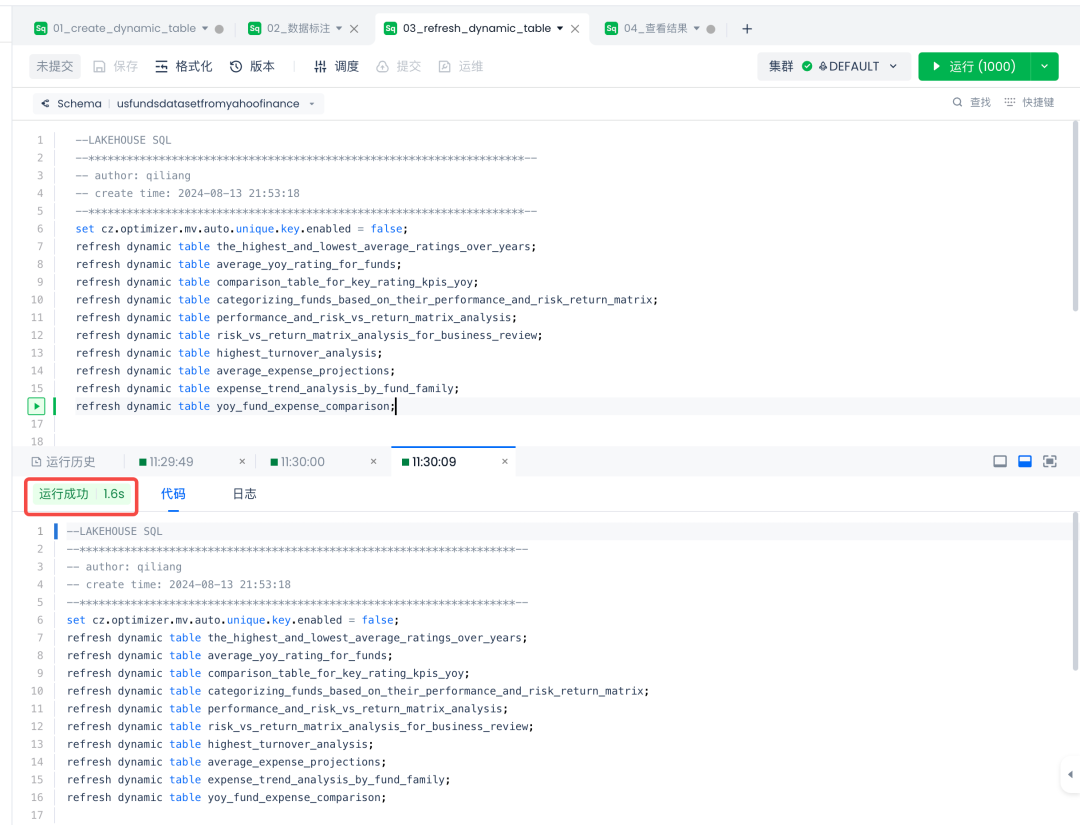 可以看到在云器Lakehouse执行上述10个动态表的结果刷新,仅用了1.6秒。而这10个刷新动作的底表有7千多万行数据,之前担心执行性能的问题,发现也不是问题嘞。