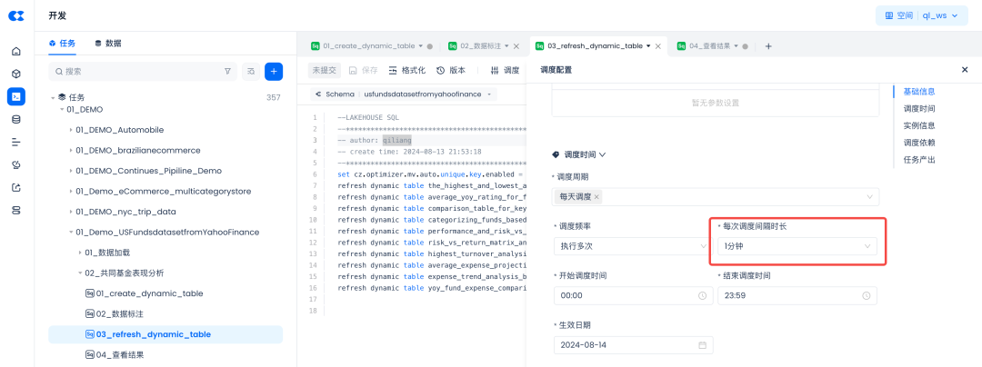 通过设置每次调度间隔时长为1分钟,这样就可以将动态表的数据新鲜度保持在分钟级了,也就是说当底表数据发生变化1分钟后,结果表的结果就会自动被刷新了。