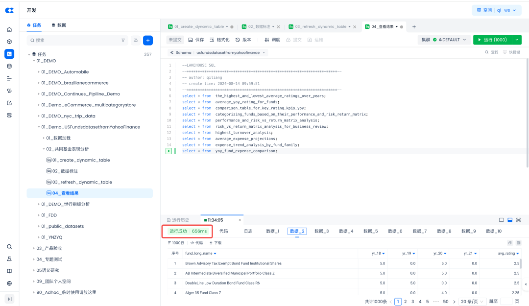 云器Lakehouse支持SQL和Python等语言进行数据分析,这就激发了笔者对其中“SQL Mutual Fund Performance”SQL代码的好奇心: