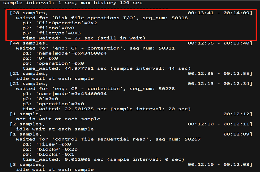 由上图trace详细跟踪日志可见,故障前数据库在长时间等待磁盘IO操作。